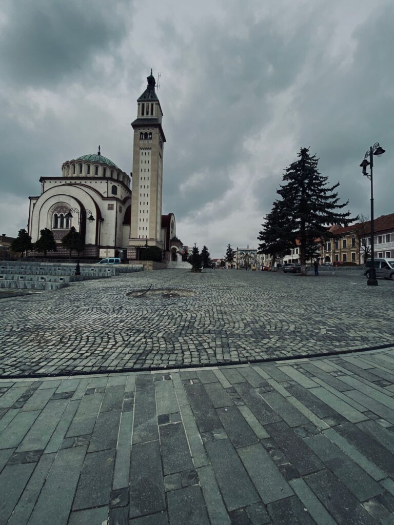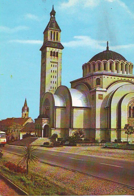 Locul ales pentru construirea acestei biserici monumentale a fost Piaţa Maria, unde în anul 1926 a fost ridicată statuia Regelui Ferdinand I, iar apoi în anul 1936 începe construcţia acetei biserici. În anul 1936, Preotul Protopop Ioan Moţa împreuna cu edilii şi locuitorii încep construcţia bisericii. Costrurile pentru construirea acestei catedrala s-au ridicat undeva la 12 milioane de lei. Banii aceştia fiind primiţi din diferite fonduri. Catedrala a fost terminată în 1943, iar la sfințirea acesteia, în 1945 a asistat Petru Groza, șeful guvernului comunist. În perioada demolărilor bisericilor din cauza comunismului biserica a primit o donație anonimă, de la legionari, de materiale necesare pentru a se putea restaura acoperișul.